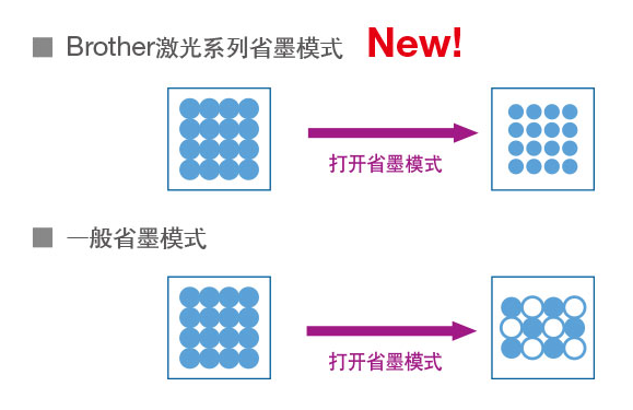 Brother支持省墨模式,通過縮小墨點的大小來達到省墨的效果,而不是通過減少墨點,這樣即使使用省墨模式,也能保證打印效果。